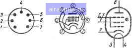Главная -> Развитие радиоэлектроники 0 1 2 3 4 5 6 7 8 9 10 [11] 12 13 14 15 16 17 18 19 20 21 22 23 24 25 26 27 28 29 30 31 32 33 34 35 36 37 38 39 40 41 42 43 44 45 46 47 48 49 50 51 52 53 54 55 56 Баллон наполнен ксеноном. Катод оксидный, косвенного накала. Время разогрева 30 сек. ![]() Рис. 29. Тиратрон ТГЗ-0.1/1.3: 1 - вторая сетка; 2 - каюд; S я 4~ подогреватель (накал); 5 и 7 - первая итре тья сетки; 6 - анод. Работает в любом положении. Температура окружающей среды от -60 до +70° С. Охлаждение естественное. Срок службы - не менее 500 ч. Номиналы1ые электрические данные (вторая сетка соединена с катодом) Напряжение накала, в............... 6,3 Ток накала, ма .................. 600 ±60 Напряжение зажигания при напряжении на первой сетке, равном нулю, и сопротивлении в ее цепи 100 ком, в ......................... не более 30 Падение напряжения на приборе, в.........не более 11 Характеристика зажигания отрицательная. Напряжение запирания на первой сетке при переменном эффективном напряжении на аноде 460 в, напряжении на второй сетке, равном нулю, и сопротивлении в цепи анода 3 ком: при сопротивлении в цепи сетки 100 ком, в . . . . -4,5 при сопротивлении в цепи сетки 10 Мом, в . . . . -7 Ток утечки между катодом и подогревателем при постоянном напряжении между катодом и подогревателем 100 в, мка , , ,..................не более 20 Предельно допустимые электрические величины Наибольшее напряжение накала, в ........... 6,9 Наименьшее напряжение накала, в........... 5,7 Наибольшая амплитуда обратного напряжения на аноде, ке.......................... 1,3 Наибольшая амплитуда прямого напряжения на аноде, в . 65G Наибольшая амплитуда тока в цепи анода, ма ..... БОО Наибольшее значение среднего тока в цепи анода, ма . . 100 Наибольшее отрицательное напряжение на первой и второй сетках, в ....................... -100 Наибольшее напряжение меиау катодом и подогревателем при отрицательном потенциале на подогревателе (обратная полярность недопустима), в............ 50 Наибольшее сопротивление в цепи первой сетки, Мом , , 10 . . Условия эксплуатации 1. Рекомендуется работать при сопротивлении в цепи первой сетки от 1 ком До ! Мом. 2. При отсутствии напряжения на второй сетке необходимо соединять ее с катодом. 3. При включении в цепь первой сетки сопротив пения необходимо обеспечивать хорошую изоляцию и экранировку. 4. Необходимо защищать тиратрон от воздействия внешних магнитных и электростатических полей. 5. Для сохранения электрических параметров необходимо отсутствие конденсации пара на наружных деталях тиратрона. Тиратроны тлеющего разряда Тиратроны тлеющего разряда являются безнакальными маломощными управляемыми приборами с холодным катодом (ТХК), предназначенными для работы в схемах электроавтоматики, электронной импульсной аппаратуре, вычислительных машинах, релаксационных генераторах и других устройствах малой мощности. Тиратрон тлеющего разряда представляет собой стеклянный малогабаритный баллон, наполненный одним или смесью инертных газов под низким давлением (20-30 мм рт. ст.), в котором помещены анод, один или два управляющих электрода (сетки) и холодный ненакаливае-мый катод. Катод выполняется в виде металлического циливдра, активированного цезием. Анод представляет собой молибденовый стержень, помещенный в стеклянную трубку с выступающим из стекла свободным концом. Сетка изготовлена из никеля, имеет форму диска с центральным отверстием и расположена между анодом и катодом. Тиратрон - это своеобразное высокочувствительное реле, которое 