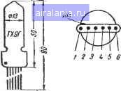 Главная -> Развитие радиоэлектроники 0 1 2 3 4 5 6 7 8 9 10 11 12 13 14 [15] 16 17 18 19 20 21 22 23 24 25 26 27 28 29 30 31 32 33 34 35 36 37 38 39 40 41 42 43 44 45 46 47 48 49 50 51 52 53 54 55 56 Напряжение входного сигнала длительностью 10 мксек иа разрешающей сетке, е.................. 100 Сопротивление в цепи разрешающей сетки, Мом ..... 1 Сопротивление в цепи запрещающей сетки, Мом ...... 0,5 ТХ8Г Тиратро» тлеющего разряда «5/5 t ? 3 i S ![]() чм I ? 31, 5 ![]() Рис. 37. Тиратрон ТХ8Г: л -анод; 2 -катодная сетка; 3 -вторая 4 - первая разрешающая сетка; 5 - катод; ная метка возле вывода /. разрешающая сетка; ;; ИМ - индикатор- Предназначеи для выполнения логической операции «Я». Выпускается в стеклянном сверхминиатюрном оформлении. Баллон наполнен неоном. Цоколь выводной проволочный. Сгиб выводов допускается нз расстоянии не менее 5 мм от стекла баллона. Работает в любом положении. Температура окружающей среды от -60 до --85° С. Охлаждение естественное. Срок службы - не менее 5000 ч. Вес - ие более 4 г.. Номинальные электрические данные Запаздывание зажигания подготовительного разряда после включения напряжения на катодную сетку при напряжении на ней 270 е в темноте, сек ..... Ток подготовительного разряда, мка ....... Падение напряжения между катодной сеткой и катодом, в..................... Падение напряжения между анодом и катодом при токе Б цепи аиода 2 ма, в ............ Предразрядный ток второй разрешающей сетки, мка Время восстановления рабочего напряжения на аноде,* мксек ........i............. Время восстановления управляющего действия сеток,* мксек ...................... Время запаздывания импульса анодного тока относительно сигнала на второй разрешающей сетке **, мк£ек ...................... не более 1 100 от 115 до 125 не более 140 не более I не более 100 не более 8 • при напряжении на аноде 28S е и токе в цепи анода 0,6 ш. *• При вапряженви на аноде 28S е. на первой разрешающей сетке в импульсе 140 в и на второй разрешающей сетке в импульсе. 120 е. Опережение сигнала на первой разрешающей сетке относительно второй 15 мксек (под импульсным напряжением подразумевается сумма напряжений смещения и входного сигнала). Длительность фронта импульса тока в цепи апода при напряжении иа аноДе 285 в и токе в цепи анода 2 ма, мксек ......................около I Сопротивление изоляции между разрешающими сетками и остальными электродами, соединенными вместе, М.ОМ ......................не менее 200 Предельно допустимые электрические величины Наибольшая амплитуда прямого напряжения на аноде, в » 300 Наименьшая амплитуда прямого напряжения на аноде, в , 270 Наибольшее напряжение на разрешающих сетках, в ... 250 Допустимые пределы изменения тока подготовительного разряда, мка ....................... lOOdhlO Наибольшая амплитуда тока в цепи анода, ма...... 400 . Наибольшее значение среднего тока в цепи анода, ма . . i Наименьшая длительность спада сигнала на первой разрешающей сетке, мксек.................... « 15 Типовой режим эксплуатации Напряжение на аноде, в.............., , . 285 Напряжение смещения на первой разрешающей сетке, в . . 40 Напряжение смещения на второй разрешающей сетке, в . . 20 Ток подготовительного разряда, ма............ 0,1 Напряжение входного сигнала длительностью ие менее 25 мксек на первой разрешающей сетке, в .......... 100 Входной сигнал длительностью 10 мксек на второй разрешающей сетке, в ......................... 100 Опережающий сдвиг сигнала на первой разрешающей сетке относительно сигнала на второй разрешающей сетке, мксек . 15 Сопротивление в цепи первой разрешающей сетки, Мом > . 1 Сопротивл