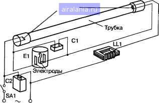 ![]() Рис. 1.33. гзбаритиые размеры лампы ENDURA Лампа OSRAM ENDURA® разработана специально для таких областей применения, в которых замена ламп представляет собой очень трудоемкий процесс, например, в наружном освещении, для промышленных цехов с высокими потолками или систем освещения в туннелях. В области создания светильников с лампами ENDURA® особенно преуспела фирма «Адольф Шух» в г. Вормсе (Германия). Ее специалисты разработали светильники, предназначенные для экстремальных климатических условий в камерах глубокой заморозки, смонтировали в 1998 г. светотехническую систему, состоящую из ста светильников с лампами ENDURA® по 150 Вт, в цехе хлорного газа химического объединения «Buna-Leuna-01efinverbund» и создали взрывозащищенные светильники класс f «повышенная безопасность». В США И Канаде OSRAM известна под именем SYLVANIA, а без-. электродная ИЛЛ ENDURA® называется ICETRON. Цена комплекта ENDURA® составляет около 150 евро. ![]() Мс. 1.34. Примеры прт1енения безэлектродных ИЛЛ ГЛАВА 2 пускорегулирующие аппараты, или как правильно зажечь и питать люминесцентные лампы 2.1. электромагнитные пра. принцип работы и недостатки Как мы уже знаем, для нормальной работы ЛЛ необходим пускоре-гулирующий аппарат (сокращенно ПРА) - электротехническое устройство, обеспечивающее режимы зажигания и нормальной работы люминесцентной лампы. ПРА работает в электрической цепи с ЛЛ и служит, главным образом, для стабилизации тока при разряде в ЛЛ. Наиболее распространенной и простой схемой включения люминесцентной лампы является стартерная (с простым индуктивным сопротивлением - дросселем, рис. 2.1). Электроды ![]() Сеть Рис. 2.1. Стартерная схема электромагнитного ПРА: Е1,С1 - стартер; 02 - служит для повышения коэффициента мощности (он же помехоподавляющий) конденсатор; LL1 - токоограничительный дроссель; SA1 - включатель/выключатель. -220 В 50Гц Стартер Рис. 2.2. Упрощенная электрическая схема Рассмотрим принцип работы схемы. Холодная люминесцентная лампа EL имеет высокое сопротивление между своими электродами. Поэтому при включении напряжение сети, проходя через накальные электроды лампы, целиком падает па ключевом элементе стартера. Ключевой элемент - это небольшая неоновая лампочка, имеющая два электрода. Один из электродов жесткий и неподвижный, а другой - биметаллический (могут быть и оба биметаллическими в зависимости от типа стартера), изгибающийся при нагреве и замыкающий цепь в нагретом состоянии. В холодном состоянии он разомкнут. Поскольку на электродах этого ключа появляется разность электрических потенциалов, газ в колбе стартера ионизируется и разогревает биметаллическую пластинку. В какой-то момент ключ стартера замыкается, и появившийся в цепи электрический ток начинает «накачивать» в дроссель L энергию. Кроме того, этот ток разогревает электроды люминесцентной лампы. Разогретым электродам присущ эффект термоэлектронной эмиссии, щироко использующийся в электронных лампах, кинескопах, вакуумных индикаторах. Итак, в наполняющем баллон лампы газе появляются свободные заряды. Одновременно с этим, после замыкания ключевого элемента стартера, разряд в нем гаснет, биметаллическая пластина остывает и затем ключ размыкается. Энергия, накопленная в индуктивном элементе L, переходит в заряд конденсатора С. Резонансный бросок напряжения на конденсаторе, величина которого превышает напряже