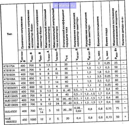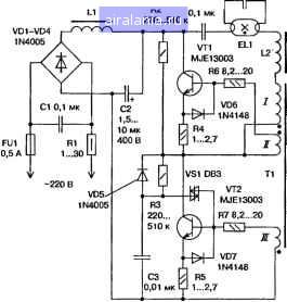 Главная -> Домашний мастер 0 1 2 3 4 5 6 7 8 9 10 11 12 13 14 15 16 17 18 19 20 21 22 23 24 [25] 26 27 28 29 30 31 32 33 34 35 Технические параметры БМТ. используемых в электронных балластах Таблица 2.11 ![]() силовыми БМТ VT1 и VT2. Последовательно с обмоткой I включен токоограничительный дроссель L2, который с конденсатором С5 образует резонансный контур. Резонансная частота контура определяется по известной нам формуле в момент подачи напряже1П1я на преобразователь и после его запуска в контуре L2, С5, EL1 появляется напряжение ударного возбужде- 04 0,033... I 0,1 мк 220...510 к ![]() Рис. 2.39. Принципиальная схема полумостового инвертора с самовозбуждением на ШЕ13003 НИЯ, импульсное значение которого составляет около 1000 В, что вполне достаточно для зажигания ЛЛ. После зажигания ток, который проходит через лампу, резко уменьшает добротность контура, шунтируя С5. Преобразователь работает на высокой частоте, и индуктивное сопротивление дросселя L2 ограничивает ток лампы. Из особенностей работы преобразователя можно отметить узел автозапуска на симметричном динисторе VS1 и токовое управление коммутацией силовых транзисторов. Цепь автозапуска необходима, поскольку генератор с обратной связью по току сам не запускается. После включения питания конденсатор СЗ заряжается через резисторы R2, КЗ. Когда напряжение на СЗ достигает 30 В, симметричный динистор VS1 пробивается, и импульс разряда конденсатора СЗ открывает транзистор VT2, в результате чего запускается генератор. С помощью диода VD5 в процессе работы генератора СЗ п0ддерживают в разряженном состоянии. Открытия VT2 и запуск генератора приводит к тому, что в обмотках трансформатора Т1 наводится ЭДС, полярность которой определяется 18оо...здоо 630 В направлением их намотки. Полярность ЭДС в базовых обмотках обратных связей I и II противоположны. Поэтому открытие и закрытие силовых транзисторов происходит попеременно в момент насыщения сердечника трансформатора Т1. Одним из недостатков подобных преобразователей является наличие сквозных токов через силовые транзисторы. Дело в том, что закрытый транзистор начинает открываться одновременно с началом закрывания открытого транзистора в момент насыщения трансформатора. Открывание транзистора происходит всегда быстрее, чем закрывание, в результате чего некоторое время (около 1 мкс) транзисторы обоих плеч моста преобразователя оказываются включенными. Спасает транзисторы MJE13003 от выхода из строя относительно высокое сопротивление в состоянии насыщения и наличие токоограничительных резисторов R4, R5 в эммитерных цепях. Попытка установить в преобразователь транзисторы с малым сопротивлением насыщения (особенно в схемах, где отсутствуют токоограничительные резисторы R4, R5) приводит к их быстрому выходу из строя. Элементы С1, R1 и L1 предотвращают распространение по электросети радиопомех, возникающих при работе генератора. Резистор R1 также ограничивает начальный токовый импульс, возникающий при заряде электролитического конденсатора С2. Не стоит удивляться разбросу номиналов элементов, указанных на схеме, - он реально существует для ламп различной мощности и разных производителей, конечно, с учетом того, что парные элементы (например, резисторы R2 и R3) имеют одинаковые номиналы. Это же касается и диодов с транзисторами - на схеме указаны лищь наиболее часто встречающиеся типы. Дроссель L2 собран на миниат