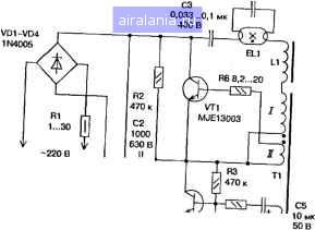 - - RS 8,2... VD5 1N4148 Рйс. 2.41. Схема маломощного преобразователя Главное отличие от предыдущего варианта - отсутствие цепи автозапуска. Режим мягкого самовозбуждения создается здесь вследствие при-открывания транзистора VT2 током через резисторы R2 и R3. Запуску также способствует конденсатор С5, создающий добавочный импульс базового тока транзистора VT2 в момент включения питания. Следующие варианты электронных балластов предназначены для работы с более мощными ЛЛ, мощность которых от 18 до 36 Вт. Существуют варианты, работающие как на одну, так и на две ЛЛ. Внешний вид недорогих электронных балластов показан на рис. 2.42. ![]() Рис. 2.42. Внешний вид недорогих электронных балластов Первый, на который мы обратим внимание, это электронный балласт китайской фирмы LUXOR (рис. 2.42.а). Он предназначен для работы с кольцевыми лампами мощностью 22...32 Вт. На рис. 2.43 показан его внешний вид. ![]() Рис. 2.43. I. Внешний вид платы электронного балласта китайской фирмы LUXOR Схемотехнически и по принципу работы он не отличается от рассмотренных выше схем. На рис. 2.44 показана принципиальная электрическая схема. На рис. 2.4.5 - печатная плата с расположением элементов. Следует отметить, что в погоне за уменьшением себестоимости электронного балласта китайские производители исключили помехопо-давляющий фильтр и предохранитель. Фильтрующий конденсатор С1 имеет минимальную величину, при которой еще сохраняется работоспособность устройства. Данная схема является классическим примером электронного балласта, наглядно показывающим, как при минимальном количестве недорогих элементов можно заставить светится ЛЛ. Некоторые китайские производители используют в электро1шых балластах с заявленной мощностью 40 Вт маломощные транзисторы. На рис. 2.46 показан внешний вид такого балласта. Более надежным в плане схемотехники является электронный балласт фирмы VITO. Внешний вид показан на рис. 2.47. ![]() 10 мк 400 В Т1 , R1 22 VT1 MJE13005 7-4 вит. L1 2,54 мГн R3 1 М 02 3900 1-9 вит. ![]() 03 6800 1000 В =Ь= 0,047 мк EL1 32 Вт VD5 }-, 1N4007 Ж-Лвт. VT2 MJE13005 560 к },022 мк Рис. 2.44. Принципиальная схема электронного балласта LUXOR 0 1 2 3 4 5 6 7 8 9 10 11 12 13 14 15 16 17 18 19 20 21 22 23 24 [25] 26 27 28 29 30 31 32 33 34 35 0.0094 |