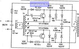: С1 Рис. 2.52. Структурная схема преобразователя зеванный катушкой индуктивности L1 и конденсатором С1, параллельно которому включена люминесцентная лампа EL1. Инвертор преобразует постоянное напряжение аккумуляторной батареи 13,2 В в переменное в виде импульсов прямоугольной формы амплитудой 150 В, поступающее на последовательный колебательный контур L1, С1. Резонансная частота контура равна частоте питающего напряжения, а ток, протекающий через нагрузку, подключенную к конденсатору контура, не зависит от ее сопротивления. При этом в момент подачи питающего напряжения сопротивление лампы EL1 велико, к конденсатору С1 приложено высокое напряжение, а через катушку индуктивности L1 протекает ток, превышающий номинальное значение. Этот ток течет и через нити накала EL1, разогревая их, что обеспечивает надежное включение лампы. При загорании лампы ее сопротивление падает и шунтирует конденсатор С1. В результате напряжение на нем снижается до значения, поддерживающего горение лампы, а ток через катушку индуктивности L1 уменьшается до номинальной величины. Принципиальная электрическая схема преобразователя показана на рис. 2.53. Колебательный контур образован элементами L2, С7. Инвертор вьшолнен по схеме двухтактного автогенератора с положительной обратной связью по току (ПОСТ) на элементах Т1, Т2, L1, VT1, VT2, VD1- VD6, С2-С5, R1-R4. Такое построение инвертора позволяет минимизировать энергию, затрачиваемую на управление ключевыми транзисторами VT1, VT2, и снизить влияние напряжения источника питания на стабильность работы преобразователя. В этом случае легко обеспечиваются и оптимальные частоты преобразования. Кроме указанных выше элементов, преобразователь содержит плавкий предохранитель FU1, конденсатор С1, защищающий источник питания от импульсных токов, и цепочку Сб, R5, подавляющую высокочастотные колебания напряжения на обмотках трансформатора Т2. Работает преобразователь следующим образом. В момент подачи питающего напряжения транзисторы VT1, VT2 закрыты, и напряжение на их коллекторах равно напряжению питания. Через резисторы R1, R2 протекает ток, заряжающий конденсаторы С2, СЗ в направлении, противоположном их полярности, указанной на схеме. Через некоторое ![]()