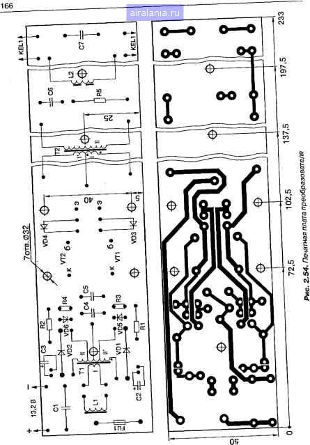 С7 4700 Рис. 2.53. Принципиальная электрическая схема преобразователя время напряжение на базе одного из транзисторов (например, VT1) достигнет порога его открьшания, и через коллекторную цепь потечет ток, который пройдет также через источник питания, обмотку I трансформатора Т2 и обмотку Ш трансформатора Т1. В результате появится ток и в обмотке II трансформатора Т1, который, в свою очередь, потечет через конденсатор С2 и переход «база-эмиттер» транзистора VT1. При этом VT1 входит в режим насыщения, а конденсатор С2 перезаряжается в соответствии с указанной на схеме полярностью. Его перезарядка ограничивается диодом VD1. Таким образом происходит запуск преобразователя. Транзистор VT1 будет находиться в состоянии насыщения до тех пор, пока не прекратится базовый ток, что может произойти в результате снижения тока через первичную обмотку трансформатора Т2 или при коротком замыкании обмоток трансформатора Т1. Запускается преобразователь на резонансной частоте контура L2C7, и транзисторы VT1, VT2 будут переключаться в момент перехода через нуль тока дросселя L2. После зажигания лампы EL1 и шунтирования ею конденсатора С7 передача энергии дросселя L2 лампе и конденсатору С7 затягивается, и частота преобразования снижается. Ее стабилизация при этом происходит на уровне, определяемом временем перемагничивания цросселя L1, который, насыщаясь, замыкает накоротко обмотку трансформатора Т1, что приводит к закрыванию одного транзистора и откры-5анию другого. Частота настройки колебательного контура выбрана рав-юй 46 кГц, а рабочая частота преобразователя - 20...25 кГц. При таком )тношении частот обеспечивается максимальная эффективность работы. Депочки С4, VD5, R3 и С5, VD6, R4 служат для снижения амплитуды юммутационного импульса на коллекторах транзисторов VT1, VT2 при к закрывании. ![]() Преобразователь смонтирован на печатной плате из фольгирован-ного стеклотекстолита размерами 233x50 мм. Чертеж возможного варианта печатной платы преобразователя изображен на рис. 2.54. Плата рассчитана на установку резисторов МЛТ, конденсаторов К73-17 (С1, С4, С5), К50-35 (С2, СЗ) и К15-5 (остальные), диодов серий КД105 (VD1, VD2) и КД212 (VD3-VD6). Транзисторы VT1, VT2 закрепляют с помощью стандартных фланцев и винтов с гайками М4 на Г-образных теплоотводах (на рис. 2.54 изображены штрихпунктирными линиями). Каждый из них сгибают из пластины листового алюминиевого сплава АМц-П толщиной 2 мм (размеры заготовки - 85x50, полки - 50x12 мм) и привинчивают к плате винтами с гайками МЗ. Выводы транзисторов соединяют с печатными проводниками отрезками монтажного провода. Резисторы R3, R4 устанавливают перпендикулярно плате. Электронный балласт может быть встроен в светильник или помещен в отдельный кожух. При монтаже дроссель L1 и трансформатор Т1 желательно разместить возможно дальще от трансформатора Т2 и дросселя L2, а оксидные конденсаторы С2, СЗ не располагать в непосредственной близости от транзисторов VTI, VT2 и резистора R5. В преобразователе применены конденсаторы К73-17 (С1, С4, С5) на напряжение 63 В, К50-35 (С2, СЗ) на напряжение 25 В и К15-5 (Сб, С7) на напряжение 1,6 кВ. Транзисторы КТ803А можно заменить на КТ908 с любыми буквенными индексами. Их желательно выбрать с одинаковым коэффициентом передачи тока базы. Примененные в устройстве диоды КД105 могут иметь любой буквенный индекс. Подойдут и другие низ- f кочастотные диоды с допустимым прямым то