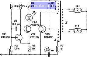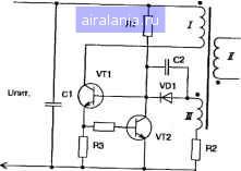 Главная -> Домашний мастер 0 1 2 3 4 5 6 7 8 9 10 11 12 13 14 15 16 17 18 19 20 21 22 23 24 25 26 27 28 29 [30] 31 32 33 34 35 Моточные узлы Дроссель L1 индуктивностью 3,3 мГн выполнен на Ш-образном магнитопроводе из феррита М2000НМ. Типоразмер сердечника - Ш5х5 с зазором 5 = 0,4 мм. Провод диаметром 0,2 мм, обмотка содержит 230...240 витков. Импульсный трансформатор Т1 вьшолнен на броневом сердечш1ке R22 из феррита 2()00НМ; обмотки 1...2 и 2...3 содержат по 18 витков провода ПЭЛ диаметром 0,5 мм; обмотка 4...5 содержит 150...160 витков провода ПЭЛ диаметром 0,2 мм. Конструктивно балласт вьшолнен на печатной плате из фольгирован-ного стеклотекстолита размерами 67x45 мм. Печатная плата показана на рис. 2.68. Надо отметить, что вместо КР1211ЕУ1 вполне можно использовать специализированные микросхемы IR2153, IR2156, IR2520, UBA2021, которые предназначены для реализации высоковольтных балластов, учитывая, что минимальное напряжение питания у этих микросхем составляет около 9...10 В. Однотактные преобразователи Довольно часто для реализации электронных балластов, работающих от низковольтных источников питания, используют однотактные повышающие преобразователи. Достоинством этих преобразователей является низкая стоимость реализации. Среди различных схем предельной простотой отличается однотакт-ный автогенераторный преобразователь, схема которого приведена на рис. 2.69. Рассмотрим вначале кратко принцип его работы. Трансформатор Т1 - линейный дроссель; интервалы накопления энергии в нем и передачи накопленной энергии в нагрузку разнесены во времени. На рис. 2.70 показаны временные диаграммы, поясняющие работу преобразователя. При подключении питающего напряжения С/ит через резистор R1 начинает проходить ток базы транзистора VT1. Диод VD1 препятствует прохождению тока по цепи базовой обмотки, а шунтирующий его конденсатор С2 увеличивает положительную обратную связь (ПОС) на этапе формирования фронтов напряжения. Транзистор приоткрывается, замыкается цепь ПОС через трансформатор Т1, в котором происходит регенеративный процесс накопления энергии. Транзистор VT1 входит в насыщение. К первичной обмотке трансформатора приложено напря- ![]() CS «СГЗ» Sc2r2 Rl HL1 ![]() Рис. 2.68. Печатная плата балласта-а-рисунок печатных прсвсдников. б - размещение элементов ГстаГтТоГбаГ/if транзистора VT1) линейно нарастает, iок базы/в насыщенного транзистора определяется наппяже- где /г21э - статический коэффициент передачи тока транзистора VT1, транзистор выходит из режима насыщения, и развивается обратный регенеративный процесс: транзистор закрывается, и энергия, накопленная трансформатором, передается в нагрузку. После уменьшения тока вторичной обмотки вновь начинается этап накопления энергии. Интервал времени t„ максимален при включении преобразователя, когда конденсатор СЗ разряжен, и напряжение на нагрузке равно нулю. Рассматриваемая схема является функциональным преобразователем источника напряжения питания f/пит источник тока нагрузки 1ц. Важно отметить, поскольку этапы накопления энергии и ее передачи разнесены во времени, максимальный ток коллектора транзистора не зависит от тока нагрузки, т. е. преобразователь полностью защищен от замыканий на выходе. Однако при включении преобразователя без нагрузки (режим холостого хода) всплеск напряжения на обмотке трансформатора в момент закрывания транзистора может превысить максимально допустимое 