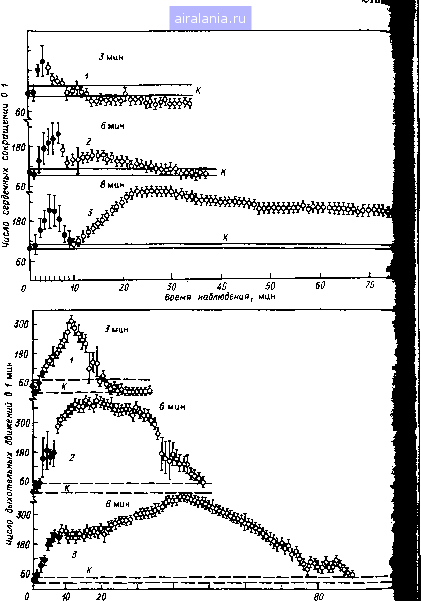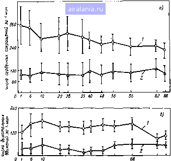 Таблица 5.1. Энерготраты Q человека (мужчина 60-70 кг, рост 170-180 < 20-30 лет. Температура окружающей среды 15-20С) Условия Основной обмен В покое Работа: легкая тяжелая чрезмерно тяжелая до полного физического истощения в открытом космосе на поверхности Луны Суточные колебания: мужчина женщина Зависимость от возраста (покой, сидя,стоя): До 1 года*2 9-11 лег*з 20-30 лег 50 лег Увеличение основного обмена прн приеме пищи иа 10-15% Сезонные колебания энерготрат ±10-15% Сердечная недостаточность (повышение на 30-50%) Нарушение функщ1Н щитовидной железы (+20-40%) Примечание, б, = 152Л/*; (2 =66,5 +13,8М+0,5Я-6,8г, где (?„ • энерготраты (муж.); М- масса, кг; Н - рост, см; t - возраст, годы. * Поверхность 1,8 м (S). *М=г,5кг, 5=0,21 м*. *ЗЛ#=30кг, 5 = 1,1 м около 4 мВт/см. Физиологические колебания основного обмена ляют около 10%, или 0,5 мВт/см. Забегая несколько вперед и j вая это значение с точки зрения установления "пороговых ур можно с уверенностью сказать, что дополнительный приток (в том числе и электромагнитной) извне, равный 0,5 мЕ (500 мкВт/см), не может нарушить тепловой гомеостаз человека. у века очень совершенная теплорегуляция. Достаточно сказать, что с i шением температуры окружающей среды с 12 до 48С тепловая : димость тканей возрастет почти в 8 раз, а при физической натру в 130 раз (!). Особая роль принадлежит конечностям, кро1 которых изменяется в широких пределах. Однако интенсивность вого потока наибольшая в области головы. С физиологической зрения это вполне понятно, поскольку гипоталамус осуществляет ] щпо температуры тела. Температурные колебания мозга у человека! дятся в пределах 0,1 °С (у мьпией 1 "С) с чувствительностью pears 0,01 "С. Повьпиение температуры на такую величину вызывает ние теплопродукции на 10% (соответствует уровню физиолог олебаний основного обмена). Отсюда следует, что область головы по равнению с эквивалентной массой туловища должна быть более чувстви-йтьяа к перегреванию при локальном воздействии ЭМИ. Биологические эффекты при неравномерности облучений ЭМП изучали jjHO (цит- по [54]). Эта проблема интересна и с гигиенической точки зрения [46]. В наших исследованиях (И. Б. Ушаков, В. Г. Зуев) бьша доказана большая поражаемость организма (по критерию гибели) в случае локального облучения головы ЭМП. Опыты поставпены на крысах, которых облучали в пластиковых пеналах. Обла--ги тела экранировали алюминиевой фольгой. В ряде экспериментов использовали рздиопоглощающий материал с ослаблением в 36 дБ. Варианты различных условий Облучения представлены на рнс. 5.11. Животных подвергали микроволновому облучению (2,4 ГГц) при ППЭ 300 ±60 мВт/см и времени облучения, равном приблизительно среднеэффективному времени. Поэтому с этой целью были проведены предварительные эксперименты для получения кривых время-эффект прн трех вариантах облучения: общее облучение, облучение 75% массы тела (кроме головы), облучение головы (25% массы тела). Соответственно получены следующие зависимости: £=18,2f-33; Z,=13,lf-31; Z,=5,8r-7,5, где L - гибель выражена в пробит, ед.; г - время облучения, мин. Эксперименты показали, что при равных массах облученных тканей и практически одинаковых локальных УПМ эффект всегда выше, когда в ЭМП находилась голова (табл. 5.2). Кранно-каудальное облучение (вариант IV) в условиях экранирования животных по длине тела (экран в виде цилиндра) также более эффективно, чем каудо-краниальное (вариант IV) воздействие: гибель животн