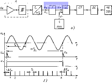 «г ф2 ![]() ![]() Рис. 9.4 где М» и Aik - погрешности дискретизации начала и конца интервала, А(д = А/„ -Ак- общая погрешность дискретизации А/ф1 и Аф2 - погрешности, обусловленные взаимным смещением исследуемых напряжений и уровней формирования, А/ф = Аф2 - - А/ф1, Аз1 и Аз2 - погрешности за счет задержки сигнала в каналах, А/з = Аз2 -А/з1. На рис. 9.3, б эти погрешности условно показаны как временные задержки между импульсами и„ и и началом и концом импульса триггера. Период повторения счетных импульсов выбирают из соотношений То= 10"" с, где к - целое число. Так, при л: = 6 число импульсов, а следовательно и показание отсчетного устройства, соответствуют временному интервалу, выраженному в микросекундах. Структурная схема измерителя периода повторения (рис. 9.4, а) отличается от схемы измерителя интервалов тем, что импульсы начала и конца интервала формируются в одном канале. В этот канал вводят делитель частоты, позволяющий в m раз увеличить измеряемый период (рис. 9.4, б). Коэффициент деления т=10~, где р - целое число. На основании рис. 9.4, б с учетом погрешностей А/ф и Аз получим Г, = (пГо -Ад -Аф-А/з)/т. (9.4) Погрешности измерений. Как следует из (9.3), погрешность измерений временных интервалов АТх = пАТо - Мя,-Мф - Мз, (9.5) где АГо - погрешность воспроизведения генератором счетных импульсов периода повторения То= 1 о. /о - частота генератора. Относительная погрешность измерений 8Тх = 8То- М,/Тх - Мф/Тх - At,/Tx. Относительная* погрешность бТо воспроизведения частоты генератора счетных импульсов в основном проявляется как медленный уход частоты вследствие старения кварца. Эта погрешность имеет преимущественно систематический характер и задается допускаемыми пределами бопь приводимыми в паспортных данных. Эта погрешность увеличивается с ростом временного интервала после выпуска прибора или его поверки. Погрешность дискретизации рассмотрена в гл. 2. Показано, что она имеет случайный характер с СКО с1=То/л[6. Предельная погрешность дискретизации составляет Го, а ее относительное значение ёпд=1/п обратно пропорционально числу п зафиксированных импульсов. Погрешность дискретизации уменьшают путем увеличения частоты fo=\/To счетных импульсов, ее предельное значение определяется быстродействием используемой элементной базы, прежде всего счетчика. В выпускаемых промышленностью приборах частота /о лежит в пределах 10...500 МГц. Погрешность Аф обусловлена двумя факторами: смещениями Af/ypi и AUypi уровней формирования в каналах и шумовыми напряжениями Um\ и иш2, воздействующими на входы. Рассмотрим ![]() ![]()