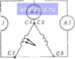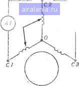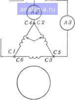 Главная -> Электродвигатель 0 1 2 3 4 5 6 7 8 9 10 11 12 13 [14] 15 16 17 18 19 20 21 22 23 24 25 26 27 28 29 30 31 при разомкнутой цепи ротора и пониженном вдвое напряжении на зажимах эпектродвигатепя. Описанный способ определения короткозамкнутых контуров применим только для открытых и каплезашишенных электродвигателей. Электродвигатели закрытого исполнения могут исследоваться только в разобранном виде, и в этом случае прежде всего следует обратить внимание на цвет изоляции катушек: потемневшая изоляция указывает на повышенное нагревание этих катушек. Для уверенности можно включить обмотку статора на пониженное напряжение и сравнить температуру катушек, прикасаясь рукой к доступным лобовым частям обмотки (после отключения обмотки от сети). Очень часто характерный запах нагретой до высокой температуры изоляции и появление дыма позволяют безошибочно определить место короткого замыкания. При-исспедовании электродвигателя ротор должен занимать нормальное положение в статоре. Фазную обмотку ротора следует разомкнуть. Фазная обмотка статора с короткозамкнутыми витками может быть обнаружена по увеличенному току в линейных проводах. При соединении обмоток звездой (рис. 19, а) показание амперметра А2 будет больше, чем двух других амперметров, если короткозамкнутый контур находится в фазной обмотке С2-0. При соединении треугольником (рис. 19,6) показания амперметров А1 и А2 в линейных проводах, присоединенных к зажимам, между которыми находится фазная обмотка С1-С4 с короткозамкнутыми витками, будет больше, чем амперметра A3. Измерение тока следует производить при пониженном напряжении, фазная обмотка ротора должна быть разомкнута. Выявление фазной обмотки, содержащей короткозам-кнутые витки, может быть произведено измерением сопротивления фазных обмоток омметром, мостом или методом амперметра и вольтметра. Фазная обмотка с короткозамкнутыми витками имеет меньшее сопротивление. Если соединение фазных обмоток выполнено внутри электродвигателя, то можно измерить значения сопротивления между зажимами электродвигате-ля В случае соединения звездой наибольшим будет сопротивление между зажимами С1 и СЗ (рис. 19,а), к которым присоединены неповрежденные фазные обмотки. Два других сопротивления будут одинаковы . и меньше первого. При соединении обмоток треугольником наименьшее сопротивление будет между зажимами С1 (С6) и С4 (С2) (рис, 19, б), между которыми находится фазная обмотка с короткоэамкнутыми витками. При использовании омметра или моста ток в измерительной цепи составляет несколько миллиампер, для него ![]() ![]() Рис. 19. Короткозамкнутые витки в фазных обмотках: а - при соединении звездой, б - при соединении треугольником сопротивление контакта в месте замыкания может оказаться большим и тогда сопротивление поврежденной и целой фазных обмоток будет почти одинаковым. Более надежные результаты дает метод амперметра и вольтметра, В случае необходимости дальнейшее определение места повреждения обмотки производится измерением сопротивления или напряжения на катушечных группах и отдельных катушках, как описано в § 2. Короткозамкнутый контур, включающий в себя катушки разных фаз, образуется из-за повреждения изоляции непосредственно между катушками (см. рис. 18, в) или между катушками и магнитопроводом статора (см. рис. 18,г). В этом случае при соединении фазных об