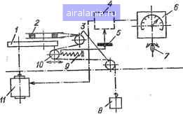 Главная -> Провода и кабели 0 1 2 3 4 5 6 7 8 9 10 11 12 13 14 15 16 17 18 19 20 21 22 23 24 25 26 27 28 29 30 31 32 33 34 35 36 37 38 39 40 41 42 [43] 44 45 46 47 и приемного. Устройство для резки состоит из двух пластин, нижняя имеет бортики соответственно ширине пленки, а верхняя накладывается в нижнюю и прижимает пленку. В конце нижней пластины через прорези, расположенные на расстоянии 2-3 мм друг от друга, вставляют лезвия бритвы таким образом, что они выступают над поверхностью нижней пластины на 3-4 мм. При движении между пластинами пленка попадает на край лезвия и режется. После резки ленты наматывают на кольца, отделенные друг от друга картонными прокладками, которые препятствуют спаданию лент с ролика. При изготовлении монтажных проводов с изоляцией из пленок фторопласта-4 предпочтение отдают центральным обмотчикам вертикального типа. В отечественной практике используют изолировочные машины с тремя головками (ВИМ-3), на каждую из которых помещают ролики с лентами фторопласта. Каждый обмотчик снабжен автоматом, останавливающим машину при сходе или обрыве ленты. Для работы с пленками различной толщины частота вращения обмотчиков изменяется с помощью трехскоростной коробки передач. Шаг обмотки при помощи сменных шестерен можно изменять как для всех трех обмотчиков, так и для каждого в отдельности. Основные технические параметры ВИМ-ЗА МО-2 Линейная скорость обмотки, м/мин . 1-9 0,6-8 Число обмотчиков....... 3 2 Максимальная частота вращения обмотчика, об/мин....... 1550 860 Максимальный шаг обмотки, мм . . 7,5 20 Диаметр изолируемых жил, мм . . 1-3,5 0,18-2 Размеры накладываемой пленки: толщина, мкм ....... ,10-100 40-100 ширина, мм......., 3-12 3-12 Натяжение ленты. Hi..... ~ 0,4-2,5 Для выпуска радиочастотных кабелей применяют горизонтальные обмотчики с эксцентричным расположением ролика - плоским или полутангенциальным. Конструкции таких обмотчиков, например ГИМ, достаточно известны и подробно рассмотрены как в учебных пособиях, так и в специальной литературе, например в [2]. в случае изготовления некоторых высоковольтных кабелей пространство между пленками фторопласта-4 заполняют кремнийорганической жидкостью. Конструктивно обмотчик не отличается от обычно применяемых, но имеет дополнительное устройство для введения кремнийорганической жидкости. Для обмотки СКЛ отечественной промышленностью разработаны специальные обмоточные машины горизонтального типа, позволяющие контролировать и поддерживать заданный уровень натяжения пленки в процессе намотки. Наиболее важным является узел регулирования натяжения пленки. В основу заложен электромеханический способ регулирования натяжения, принципиальная схема которого представлена на рис. 45. Электродвига- ![]() Ряс. 45. Схема регулирования натяжения СКЛ при обмотке. 1 - редуктор; 2 - ролик с СКЛ; 3 - поворотный ролик; 4 - блок управления; б - датчик натяжения; 6 - показывающий прибор; 7 - ручка регулирования натяжения; 8 - тарирующий груз; 9 - пружина; 10 - компенсатор; П - электродвигатель. тель, работающий в тормозном режиме, через редуктор передает тормозной момент ролику с пленкой. Натяжение задается перед началом работы за счет усилия, создаваемого пружиной, которое контролируется проволочным датчиком натяжения. Поддержание натяжения производится за счет перераспределения токов в элементах схемы сравнения, которая питается от стабилизированного источника тока, натяжение изменя