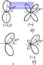 Главная -> Антенны 0 1 2 3 4 5 6 7 8 9 10 [11] 12 13 14 15 16 17 18 19 20 21 22 23 24 25 26 27 28 29 30 31 32 33 34 35 36 37 38 39 40 41 42 43 44 45 46 ![]() l=Zk ![]() Рис. 4.2. Диаграммы направленности одиночного прямолинейного провода при различных его длинах: о - оо стоячей волной тока; б - с бегущей волной тока Одиночный провод с бегущей волной тока излучает так, что диаграмма направленности симметрична относительно оси про-зода, т. е. имеет форму тела вращения. Все ее разрезы плоскостями, проходящими через ось провода, одинаковы, и, следова- тельно, диаграммы во всех плоскостях одинаковы. Кроме того, как н в случае провода со стоячей волной тока, излучение вдоль оси провода отсутствует. 4.2. Электрические вибраторы • Чаще всего в технике антенн применяют разведение проводов линии на 180° при длине каждого из них обычно ие более половины длины волны. В этом случае распределение токов и потенциалов будет иметь вид, представленный на рис. 4.3. Как видно из рисунка, для данных распределений токи в проводах направлены в одну сторону и, следовательно, излучения от каждого из проводов будут складываться в экваториальной плоскости хц. Антенна такого типа спм-метрична относительно этой плоскости ху и относительно z=0. Поэтому она называется симметричным вибратором. Напряженность поля (и диаграмма направленности) симметричного вибратора, расположенного в неограниченном свободном пространстве, может быть рассчитана по формуле rsm( - cos / 2л/ \ где 0 - угол относительно оси провода; I - половина длины вибратора. Расчетные диаграммы направленности симметричных вибраторов в зависимости от их длины приведены на рис. 4,4. Чем длиннее вибратор (в пределах /<0,625Я), тем уже у него диаграмма направленности и тем больше КНД. Пространственная диаграмма направленности симметрична относительно оси вибратора (осевая симметрия), В направлении оси вибратора излучение отсутствует. Максимум излучения лежит в экваториальной плоскости. Вектор напряженности электрического поля в дальней зоне поляризован в меридиональны.ч плоскостях. Вектор напряженности магнитного поля перпендикулярен меридиональным плоскостям. Активная и реактивная составляющие входного сопротивления симметричного вибратора изменяются в зависимости от отношения его длины к длине волны. Активное сопротивление является суммой сопротивлений излучения В 21= к. /ilUUlb Рис. 4.3. Распределение тока иа симметричных вибраторах: д - на полуволновом вибраторе; б - на одиоволновом вибраторе, длина каждого плеча которого равна половине длине волны ![]() Рис. 4.4. Диаграммы направленности симметричных вибраторов различной длины: / - элементарного диполя (гД=0); 2 - полуволнового вибратора (гА=-=0,25); 3 - одноволнового вибратора (гД=0,6); 4 -вибратора, каждое плечо которого равно 1 =0.625Я Ки,Ом то то