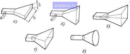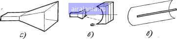 длина активного вибратора; Р -длина рефлектора; Д1, Д2, ДЗ-соответственно длины .1-го, 2-го и 3-го директоров, А-Р, А-Д1, А-Д2, А-ДЗ - расстояния между активным вибратором и соответствующим пассивным вибратором. Поскольку жесткие вибраторы неудобны при передвижении в густых зарос-.лях, часто применякп- вибраторы из гибкой профилированной стальной ленты. В некоторых случаях в метровом диапазоне применяют антенну в виде вибратора с активным рефлектором (см. рис. 6.15,6). Ее преимущество состоит в ослаблении заднего лепестка и малом расстоянии между вибраторами. Она изготавливается из трубок или проволок диаметром 4... 6 мм. Наиболее простой и чаще всего применяемой пеленгациоиной антенной для> приема вертикально поляризованных волн, является рамочная антенна. Рамочные антенны (см. в гл. 4) применялись и применяются в морской в-воздушной радионавигации для определения положения судов и самолетов нг-местности по работающим радиовещательным станциям и пр. Эти антенны используются и для радиопеленгации при «Охоте на лис» В декаметровом диапазоне волн. Глава 8. АПЕРТУРНЫЕ АНТЕННЫ 8.1. Общие сведения Апертурные антенны - это антенны, излучение у которых происходит через раскрыв, называемый апертурой (от латинского слова apertura - отверстие) . К апертурным антеннам относятся в первую очередь такие антенны, как рупорные, линзовые и зеркальные (рис. 8.1). Из самого названия этих антенн следует, что их конструкция и принцип действия аналогичны соответствующим акустическим и оптическим системам, которые в действительности и явились их прототипами. Апертурные антенны применяются главным образом в диапазоне СВЧ, т.е. на волнах короче 1 м (до субмиллиметровых). Малая длина волны позволяет сконструировать антенны, размеры которых много больше длины волны. Сле-дова-тельно, можно сконструировать остронаправленные антенны, имеющие-сравнительно небольшие размеры. Кроме того, возможно создание антенн, имеющих диаграмму направленности особой формы, определяемой специальным назначением антенны (например, антенна обзора земной поверхности с борта летательного аппарата и др.). Апертурные антенны долгие годы являлись основным типом радиолокационных антенн. Они также находят широкое применение в радионавигации, радиоастрономии, В радиотехнических системах управления искусственными спутниками Земли и космическими кораблями, в тропосферных и радиорелейныж линиях связи и т. п. Во многих из применяемых на практике апертурных антенн поле .в раскры-ве имеет одинаковую поляризацию, близко к синфазному, т. е. неизменному пор фазе, и характеризуется амплитудой, которая либо мало изменяется по раскры- ![]() Рис. 8.1. Основные типы апертурных аитеин: а - рупорные; б - линзовые; е - зеркальные ву, либо имеет максимум в середине и уменьшается по краям раскрыва. Для таких антенн ширина диаграммы направленности по половинной мощности при-флкженпо определяется выражением 260,5)° (60...80)(8.1) тае К - длина волны; L-размер раскрыва в плоскости, в которой определя-.ется ширина диаграммы. Коэффициент направленного действия можно определить по приведенным Выше формулам (ЗЛ7) и (3.18), если учесть, что коэффициент использования площади раскрыва /;и=0,5 ... 0,8. Поэтому КНД (8.2) где S - площадь раскрыва. 8.2. Рупорные антенны Если конец волновода оставить открытым, то он будет излучать электромагнитную энергию. О