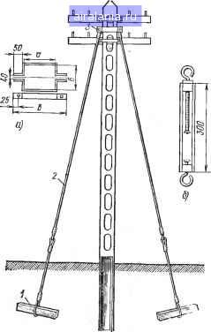 ют только оттяжками. Оттяжки к железобетонным опорам крепят с помощью двухушковых хомутов, размеры которых указаны в табл. 5.36. Оттяжку к железобетонной опоре (рис. 5.26) крепят под первой т1?аверсой за болт хомута либо винтовой стяжкой. Оконечные и кабельные опоры укрепляют двумя оттяжками. На деревянной опоре оттяжку крепят, охватывая опору двумя витками с упором их на шуруп с шестигранной головкой, ввинченный в опору с противоположной стороны. Конец оттяжки расплетают, и последовательно обвивают приложенный к оттяжке конец каждой проволокой на длине 250 ... 300 мм. Нижний конец оттяжки крепят на якорь, состоящий из якорного лежня и жгута. Якорный жгут изготовляют из такой же проволоки, что и оттяжку. При двух проволоках в оттяжке жгут состоит из четырех проволок; при трех-четырех проволоках в оттяжке - из шести проволок; при пяти-шести - из восьми проволок и при семи - из десяти проволок. При изготовлении жгута проволоку вначале наматывают на якорный лежень и лом. Поворачивая лом, свивают жгут (рис. 5.27). Направление свивания жгута должно совпадать с направлением свивания оттяжки. Угол поворота линии помимо угломера можно определять (особенно в пригородной зоне) путем измерения вылета угла. При невозможности устройства подпоры или оттяжки в данной местности на угловых опорах устраивают оттяжку с оттяжным столбом (рис. 5.28). ![]() Рис. 5.25. Заделка якорного лежия в слабых грунтах ![]() Рис. 5.26. Укрепление железобетонной опоры оттяжками: а - ДЕухушкоЕый хомут; 6 - впи гоиая стяжка: / - железобетонный лежень; 2 -оттяжка; 3 - двухушковый хомут Кабельную опору (рис. 5.29) оборудуют кабельным ящиком, кабельной площадкой, траверсами, ступенями, молниеотводами и заземлением. При емкости кабельного ящика 10X2 устанавливают три вось-миштырные траверюы, а при емкости ящика 20X2 - пять траверс. При этом кабельный ящик 10X2 устанавливают под второй траверсой, а 20X2 - под третьей. При емкости кабельного ящика 10X2 допускается установка пяти четырехштырных траверс. Кабельную площадку крепят к опоре сквозными болтами М16Х280 мм на расстоянии 1400 мм от кабельного ящика до настила пола площадки. В опору с пешеходной стороны улицы под углом 45" к плоскости траверс крепят ступени из круглой стали размером 250X16 (18) мм. Ступени ввертывают на глубину 100 мм на расстоянии 300 мм друг от друга и скрепляют жгутом, свитым из двух концов стальной проволоки ![]() Рис. 5.27. Заделка якоря 0 1 2 3 4 5 6 7 8 9 10 11 12 13 14 15 16 17 18 19 20 21 22 23 24 25 26 27 28 29 30 31 32 33 34 35 36 37 38 39 40 41 42 43 44 45 46 47 48 49 50 51 52 53 54 55 56 57 58 59 [60] 61 62 63 64 65 66 67 68 69 70 71 72 73 74 75 76 77 78 79 80 81 82 83 84 85 86 87 88 89 90 91 92 93 94 95 96 97 0.0121 | ||||||||||||||||||||||||||||||||||||||||||||||||||||||||||||||||||||||||||||||||||||||||||||||||||||||||||||||||||||||||||||||||||||||||||||||||||||||||||||||||||||||||||||||||||||||||||||||||||||||||||||||||||||||||||||||||||||||||