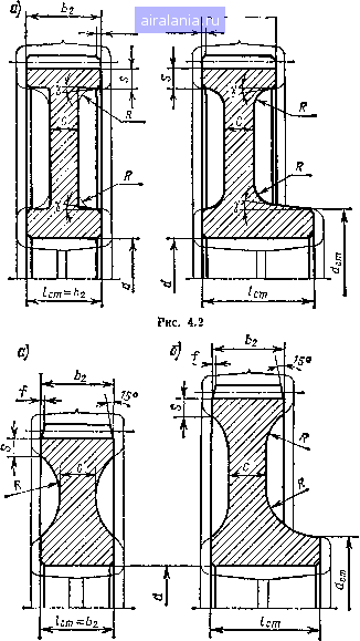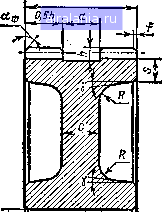 Главная -> Расчеты зубчатых передач 0 1 2 3 4 5 6 7 8 9 10 11 12 13 [14] 15 16 17 18 19 20 21 22 23 24 25 26 27 28 29 30 31 32 33 34 35 36 37 38 39 40 41 42 43 44 45 46 47 48 49 50 51 52 53 54 55 56 57 58 59 60 61 62 63 64 65 66 67 68 69 70 71 72 73 74 75 76 77 78 79 80 81 82 83 84 85 86 87 88 89 90 91 92 93 94 95 96 97 98 99 100 101 102 103 104 105 106 107 108 109 110 111 мают значения штамповочных уклонов у 7° и радиусов закруглений 6 мм. Для уменьшения влияния термической обработки зубчатых колес на точность геометрической формы, в последнее время зубчатые колеса делают массивными: С=(0,35. ..0,4)6з. fx45 fxK ![]() Рис. 4.3 t>ct Условия пластической деформации металла при штамповке улучшаются, если выемки в дисках колес выполнять по рис. 4.3, а, б. Радиусы закруглений принимают R20 мм, а штамповочные уклоны у 12°. В зависимости от соотношения размеров колес выемки в дисках оформляют одной дугой радиуса R (рис. 4.3, а) или двумя дугами радиуса R и плоскостью (рис. 4.3, б). Толщина диска в этом случае С « 0,5 &2. В тех случаях, когда важно снижение массы конструкции (например, самолетостроение), колеса делают с более тонким диском (С»0,25 Ьг), радиусы закруглений принимают минимальными, в дисках выполняют 4. . .6 отверстий. Для быстроходных колес после механической обработки проводят балансировку. С этой целью иногда производят механическую обработку кругом, как показано на рис. 4.2, а. Таблица 4.2 ![]()