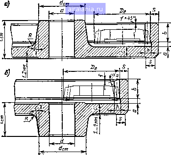 Рис. 4.4 Шевронные зубчатые колеса отличаются от других цилиндрических колес большей шириной. Наиболее часто шевронные колеса изготовляют с канавкой посередине, предназначенной для выхода червячной фрезы, нарезающей зубья. При известных размерах фрезы ширину канавки а определяют прочерчиванием. Приближенно размер канавки а можно определить по приводимому в табл. 4.2 отношению aim. Остальные конструктивные элементы шевронных колес принимают по соотношениям (рис. 4.4): /„=&+а; С= (0,3. . .0,35) (&+а); 8= =4от+2; /1=2,5от. § 2. ЦИЛИНДРИЧЕСКИЕ ЗУБЧАТЫЕ КОЛЕСА ВНУТРЕННЕГО ЗАЦЕПЛЕНИЯ Основные конструктивные элементы i, Z, S, f (рис. 4.5, a, б) в колесах внутреннего зацепления принимают по соотношениям для колес внешнего зацепления, которые приведены на с. 44. Конструктивное исполнение колес внутреннего зацепления может быть выполнено по одному из вариантов, показанных на рис. 4.5 и отличающихся расположением ступицы относительно зубчатого венца: ступица расположена внутри колеса (рис. 4.5, а), что обеспечивает лучшие условия работы зацепления по сравнению с вариантом по рис. 4.5, б, в котором ступица вынесена за контур зубчатого венца. Но первый вариант (рис. 4.5, а) можно применять в том случае, когда расстояние от наружной поверхности ступицы до внутренней поверхности зубчатого венца больше наружного диаметра De долбяка, которым изготовляют ![]() Рис. 4.5 зубья. Контур долбяка показан на рис. 4.5, а, б. В табл. 4.3 приведены диаметры De долбяка, ширина а канавки для выхода долбяка и размещения стружки, образующейся при долблении зубьев (для прямозубых колес). Таблица 4.3