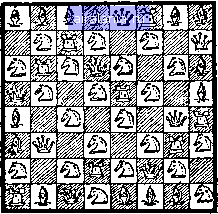 Секрет состоит, однако, в том, что не следует пытаться размещать все 6 букв каждого типа. Можно выяснить, что если мы ограничимся лишь 5 буквами каждого типа, то это количество (всего 30) можно разместить в ящике, и при этом останется лишь 6 пустых ячеек. Однако правильное решение состоит в том, чтобы разместить по 6 букв каждого из двух типов и по 5 букв оставшихся четырех типов. Исследование рисунка 2 покажет, что здесь присутствует по 6 С и D и по пять А, В, Е и F. Следовательно, остаются лишь 4 пустые ячейки, и никакие 2 одинаковые буквы не располагаются на одной прямой. 133. Решение данной головоломки приведено на рисунке. На доске можно расположить только 8 ферзей ![]() или 8 ладей так, чтобы они не атаковали друг друга, тогда как соответствующее максимальное число для сло- нов равно 14, а для коней - 32. Но поскольку всех этих коней нужно поместить на клетки одинакового цвета, тогда как ферзи уже занимают по 4 клетки каждого цвета, а слоны - по 7 клеток каждого цвета, то в результате мы можем поместить на клетки одинакового цвета лишь 21 коня. На пустой доске можно расположить более 21 коня, но мне не удалось это сделать на доске, где «царит теснота». Я думаю, что приведенное решение содержит максимальное число шахматных фигур, однако возможно, что какому-нибудь изобретательному читателю удастся поместить на доску еще одного коня. 134. Фишки можно расположить в следующем порядке: 135. На рисунке показано, как можно наклеить 16 марок на карточку при заданных условиях, причем общая сумма составит 50 пенсов, или 4 шиллинга 2 пенса. Если, наклеив 4 марки по 5 пенсов, читатель попытается наклеить также 4 марки по 4 пенса, то он сможет затем наклеить лишь по 2 марки каждого из трех оставшихся достоинств, потеряв при этом 2 пенса. Таким образом, общая сумма марок составит лишь 40 пенсов, или 4 шиллинга. Именно на эту ловушку и рассчитана данная головоломка. (Сравни с задачей 43.) 0 1 2 3 4 5 6 7 8 9 10 11 12 13 14 15 16 17 18 19 20 21 22 23 24 25 26 27 28 29 30 31 32 33 34 35 36 37 38 39 40 41 42 43 44 45 46 47 48 49 50 51 52 53 54 55 56 57 58 59 60 61 62 63 64 65 66 67 68 69 70 71 72 73 74 75 76 77 78 79 80 81 82 83 84 85 86 87 88 89 90 91 92 93 94 95 96 97 98 99 100 101 [102] 103 104 105 106 107 108 109 110 111 112 113 114 0.0097 | ||||||||||||||||||||||||||||||||||||||||||||||||||||||||||||||||||||||||||||||||||||||||||||||||||||||||||||||||||||||||||||||||||||||||||||||||||||||||||||||||||