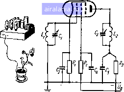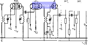 ОТ СКЕЛЕТНОЙ СХЕМЫ К ПОЛНОЙ СХЕМЕ Н. - Словом, я понял: кон- \ денсаторы развязки гораздо j. легче присоединить к корпусу, % чем тянуть их выводы к катоду. ) Л. -Да, это так. Обычно Iv корпус обоозначают символом, f;! похожим на символ заземле- i ния, так что вместо того, что- i бы рисовать общую шину ми- i нуса высокого напряжения, к: знаки корпуса рисуют непо- i средственно в тех местах, где это требуется по схеме. По это-му принципу схема на рис. 75 будет иметь вид, показанный , на рис. 76. Но запомни хоро- , шенько, что когда ты видишь [ па схеме много знаков корпу- J- са, в действительности это L только одно единственное со- f единение, ведущее к отрицательному полюсу высокого напряжения. Н. - Но теперь-то знаю ли я, наконец, обо всех скрытых опасностях в схемах радиоприемников и могу ли я сам соста-; вить схему, по которой можно было бы собрать действующий , приемник? Л. -Да, я думаю, что теперь ты знаешь примерно все, что необходимо для этого. Вернемся к схеме, которую ты по неве- ![]() Рис. 76. Та же схема, что и на рис. 75, но нарисованная с применением символа зазе.мления. ![]() Рис. 77. Упрощенная схема приемника с двумя каскадами усиления высокой частоты. ![]() дению начертил во время нашей двенадцатой беседы, и попробуем придать ей практически осуществимый вид. Вначале нарисуем ее в упрощенном виде - это прекрасный метод (рис. 77). Н. - Я надеюсь, что в обоих высокочастотных каскадах ты . используешь пентоды. Л. - Ты можешь в этом убедиться сам, посмотрев на рисунок. Но я пойду дальше, используя пентод также и во втором каскаде низкой частоты. В настоящее время охотно используют ![]() ![]() пентоды для этой цели. Ты видишь, что в этой схеме представ лены только основные цепи связи между лампами. Элементы же развязки, а также резисторы для получения напряжения смещения и резисторы в цепях экранирующих сеток в упрощенную схему не включают. V уз», п«, д уп, т. "lOIj" 11 г-АЛ г гг rTrf\ Рис. 78. Окончательная схема приемника. Н. - Словом, ты изобразил «скелет» схемы с двумя каскадами усиления высокой частоты (УВЧ\ и УВЧ2), диодным детектором (Д) и двумя каскадами низкой частоты (УНЧ1 и УНЧ2). Можешь ли ты теперь нарастить на этот скелет тело и кожу н составить таким образом целый организм? Л. - Это нетрудно. Вот полная схема (рис. 78). Кроме других особенностей, прежде всего отметь резисторы для смешения 2, Rfi и Ri\ резисторы, задающие напряжения на экранирующих сетках, и Ri\ резисторы развязки Ri и Rs, а также блокировочные конденсаторы под теми же номерами. Н. - Подожди... Меня очень интригует другая вещь: это катушки Li, L2, Z.3, Li и Z,5, которые как бы состоят из трех частей. ![]() ![]() ВОЛНА ВОЛНЕ РОЗНЬ л. - Это требует объяснения. Ты знаешь, что во всем мире имеется очень большое число радиовещательных передатчиков. Длины волн в радиовещании распределены в трех основных диапазонах. Это длинные волны (ДВ) от 1 ООО до 2 000 м, средние волны (СВ) от 200 до 600 м и короткие волны (KB) от 10 до 50 м. Каждому из этих диапазонов соответствует одна из трех обмоток, образующих катушку. Любую из них можно включить 3 контур с помощью переключателя П. Н. - Но в таком случае для перехода с диапазона на диапазон нужно одновременно изменить положение пяти переключателей. Требуется ли для быстрого переключения иметь, подобно пауку, большое число лап? Л. - О нет, не волнуйся, Незнайкин. Все контакты переключаются одновременно с помощью одной ручки управления. Н. - К сч