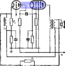 ![]() на вход в противоположной полярности к напряжению, которое их вызывает в процессе усиления. Вот мы и пришли к принципу отрицательной обратной связи. Идеальным решением было бы снимать с выхода только напряжение, соответствующее искажениям. Но его, разумеется, невозможно выделить из всего напряжения. Поэтому с выхода снимается некоторая часть и всего напряжения, которая и подается на вход усилителя в противоположной полярности с усиливаемым напряжением U (рис. 161). Что же при этом происходит? Имея противоположную полярность относительно входного напряжения U, напряжение и вычитается нз него, в результате чего входное напряжение падает до значения U - и. Но это неважно, так как снижение может быть компенсировано соответствующим усилением в других звеньях. Важно то, что в напряжении и - и имеются искажения, которые не существовали в напряжении U и которые противоположны искажениям, возникающим в усилителе. В результате искажения на выходе значительно снижаются. Так как входное напряжение U уменьшается до значения U - и частью выходного напряжения и, отрицательная обратная связь в и.чвестиой мере снижает усиление. Ее следует применять лишь в усилителях, имеющих достаточный запас по усилению, чтобы оконечная лампа, несмотря на снижение усиления, могла отдать требуемую выходную мощность. Рис. 161. Принципиальная схема отрицательной обратной связи. Необходимая часть выходного напряжения снимается с потенциометра R. Отрицательная обратная связь в схеме оконечной лампы в связи с тем, что основные искажения возникают главным образом в оконечной лампе, обратную связь часто применяют только в цепи этой лампы. Наиболее простой способ (рис. 162) заключается в соединении анода оконечной лампы Лг с анодом лампы предварительного усилителя Л через резистор R с большим сопротивлением (1-2 Л1ол1). Благодаря этому часть переменного напряжения первичной обмотки выходного трансформатора поступает через конденсатор С на управляющую сетку оконечной лампы. Следует отметить, что, как и в схеме, изображенной на рис. 161, деление выходного напряжения перед подачей его на сетку лампы производится с по- мощью делителя, аналогичного потенциометру. На рис. 162 потенциометр обра (одно плечо) и трех других параллельно плечо): внутреннего сопротивления Ri Рис. 162. Отрицательная обратная связь в усилителе низкой частоты, осуществленная с помощью резистора R, включенного между анодами двух ламп. зован из сопротивления резистора R включенных сопротивлений (другое лампы JIi и сопротивлений резисторов /? и /?2 (каждое из этих сопротивлений одним концом подключено к аноду лампы Л\, а другим - к плюсу или минусу источника вйсокого напряжения, что по переменному току эквивалентно). Так как суммарное сопротивление параллельных сопротивлений Ri, Ri и Ri мало по сравнению с сопротивлением R, на сетку лампы Л2 подается незначительная часть выходного напряжения. Отрицательная обратная связь с коррекцией тембра При желании охватить отрицательной обратной связью обе лампы усилителя низкой частоты приемника напряжение лучше снимать со вторичной обмотки выходного трансформатора, который, как мы знаем, понижает напряжение. Это напряжение подают на резистор /?, с небольшим сопротивлением (10-20 ом), включенный в цепь катода последовательно с резистором смещения первой лампы (рис. 163). Таким 