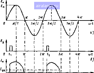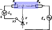 Главная -> Симисторы 0 [1] 2 3 4 5 6 7 8 9 10 11 12 13 14 15 16 17 18 19 20 21 22 23 24 25 26 27 28 29 30 31 32 33 34 35 36 37 38 1000 S00\00 400 200 ![]() ![]() О 200 400 600 800 1000 U. В рис. 2. Семейство вольт-амперных характеристик тиристора Если к управляющему электроду УЭ приложить псло;!сительпое относительно катода напряжение, то в цепи управления будет протекать ток /у, при этом ток в обратном направлении увеличится, хотя и незначительно. По мере увеличения /у возрастает ток через тиристор. Семейство обратных характеристик тиристора, как следует из рис. 2, очень похоже на семейство выходных характеристик транзистора, включен-ного по схеме с обшнм эмиттером, но с малым коэффициентом переда-чи тока. Прямая ветвь тиристора при разомкнутой цепи управления изображена в первом квадранте системы координат. Она соответствует такой полярности напряжения, когда к аноду приложено положительное относительно катода напряжение. Рабочим диапазоном, как и в случае обратной характеристики, яв- ![]() ляется диапазон от нуля до максимального прямого повторяюшегося напряжения Цювт, пр max- Характеристика имеет три области Первая область - от начала координат до точки А - аналогична обратной ветви ВАХ р-п перехода. Вторая от точки А до точки В - соответствует неустойчивому Состоянию, когда тиристор даже при незначительном превышении напряжения, называемом напряжением переключения Ц,ер, переходит в состояние с малым сопротивлением (точка В) Эта область носиг название участка с отрицательным дифференциальным сопрогив-лением. В отличие от участка характеристики с положительным сопротивлением, на котором увеличение тока сопровождается увеличением напряжения, на участке отрицательного дифференциального сопротивления увеличение тока происходит при снижении напряжения. Третья область характеристики - от точки В до точки С ~ область высокой проводимости или малого сопротивления, она аналогична прямой ветви характеристики полупроводникового диода. Это состоя-Ш1е называется также открытым илн проводящим, а состояние с высоким сопротивлением - закрытым или непроводящим Если через цепь управления пропустить ток /у, то напряжение переключения уменьшается Еспн увеличивать ток управления дальше, то, начиная с некоторого значения, называемого током управления - спрямления, участок характеристики с отрицательным сопротивлением исчезает, ВАХ спрямляется и становится похожей на прямую характеристику полупроводникового диода. В результате прн токе управления, превышающем ток управления - спрямления, прибор всегда обладает малым сопротивлением. Если учесть, что рабочее напряжение выбирается меньше максимального напряжения переключения Ц]ер, которое достигается при /у = О, а ток управления, как правило, значительно больше тока управления - спрямления, то при отсутствии тока управления тиристор находится в закрытом состоянии и прямая и обратная ветви его статической характеристики аналогичны обратной характеристике полупроводникового диода. Примечательной особенностью тиристора, как и других приборов, с отрицательным обратным сопротивлением, например тиратронов, является то, что он, переключенный в состояние с малым сопротивлением, будет находиться в этом состоянии сколь угодно долго даже прн снятии управляющего сигнала. Это свойство позволяет включать тиристор с Помощью коротких импульсов тока и тем самы