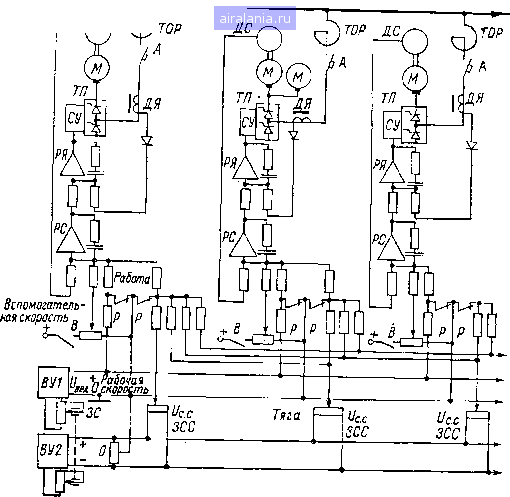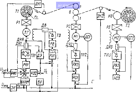 Главная -> Математическое описание сэп 0 [1] 2 3 4 5 6 7 8 9 10 11 12 13 14 15 16 17 18 19 20 21 22 23 24 25 26 27 28 29 30 31 32 33 34 тельное изменение натяжения даже при постоянстве соотношения скоростей секций. Для устранения этого нередко вводятся прямое измерение и регулирование натяжения материала [1, 25, 39]. Для придания ленточным материалам, выработанным на непрерывно-поточных агрегатах, товарного вида, а также с целью повышения качества часто производится их дополнительная обработка на отделочных агрегатах Одрадатыдаемый *) материал (CiJ4tlO) §) (Н-я секция *GI>-с секция (l+lj-n секция ![]() Рис. 1.2. Кинематическая и принципиальная схемы электропривода секций непрерывно-поточного агрегата (продольно-резательные станки, суперкаландры, меловальные машины, правильные машины и др.). Режимы работы таких агрегатов можно отнести к циклическим, связанным с перемоткой первичного рулона с раската (раз-матывателя) на накат (моталку). Цикл работы агрегата обычно состоит из установки первичного рулона на раскат, заправки материала на накат, luntoim (прегата па рабочую скорость с последующим торможением в конце И1ЧиМ1пки. Поскольку разгон и торможение происходят с обрабатываемым м,(111;1лом, а дилназон рабочих скоростей составляет до 10 и более, то и • 11 liiKiix .1грсгато11 предъявляются весьма жесткие требования. В частности, иринод должен обеспечивать поддержание заданного натяжения материала t iini рсчппостью ие выше 5% в статике и 10-15% в динамике. Это требует ИИ I д()>ип1тя соотношения скоростей двигателей с погрешностью, меньшей <1 11Д1111-два порядка, что определяется характером технологического про-нч r;i nil данном агрегате. Столь высокие требования возможно выполнить мри помощи регулируемого ЭП постоянного тока. В последние годы здесь иилучи.ч распространение многодвигательный ЭП с индивидуальными ТП и пиК-мами подчиненного регулирования. 11.1 рис. 1.3 представлена функциональная схема ЭП суперкаландра (< К) для отделки высококачественной бумаги. Механическая часть ЭП со- ![]() Расиат Капаидр Манат Рис. 1.3. .Функциональная схема электропривода суперкалан- < MMirjo раската, тамбур которого Т1 соединен с тормозным генератором ТГ itiui редуктор Р1 (в частном случае редуктор может отсутствовать), батареи Hiuioi) Б каландра, приводимых во вращение двигателем Ml через ре-itvintip Р2, и периферического наката, несущий вал которого НВ приводи i с я диигателем М2 через редуктор РЗ. V; Тормозной генератор управляется как по цепи якоря, так и по цепи ПН (Луждепия, Якорь генератора подключен к реверсивному тиристорному )ц"иГ)л:и111ателю ТШ, а обмотка возбуждения - к нереверсивному тирис-M<imtiMy иозбудителю ТВ. Преобразователь ТП1 может иметь как согласо- 1"!......с, Ifiit и раздельное управление группами. АСУ по якорной цепи ТГ i(4t4i lui.t контура регулирования: внутренний контур тока якоря с датчи-I iMiwi JlUl И;регулятором тока РЯ1 и внешний контур натяжения бумаж-•мим п,;()Г11л с датчиком натяжения ДН1 (прессдуктором) и регулятором ыIiDMiiiiti . Задание натяжения полотна в статике производится с по-Mi.triiriii ;и1ряжс!1ия Hii поступающего одновременно на вход РН1 и РЯ1-I hi Ир 11 лимне f3. н1 задает ток якоря тормозного генератора в статике /я-т-с i4iiiipi,ift поддерживается затем контуром тока. При этом*регулятор РШ играет роль корректора, и его выходное напряжение в динамике суммируется со знаком плюс или минус с напряжением (/3. „i. Для компенсации влияния механической инерционн